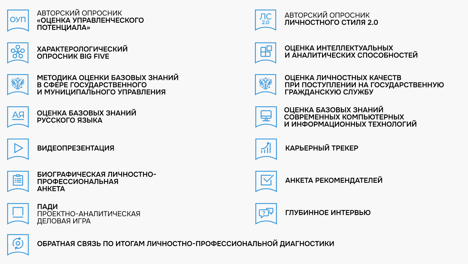 В основе методологии лежит научно-обоснованный ресурсный подход к оценке руководителей государственной сферы, личностно-ориентированный подход в управлении, психобиографический анализ личности и модель управленческих метакомпетенций (управленческой готовности). Это позволяет реализовать единый подход к выявлению ключевых профессиональных и управленческих ресурсов управленческих кадров системы государственного управления, формировать единый банк данных перспективных управленцев на основе сопоставимых данных. В основу технологии личностно-профессиональной диагностики положена трехкомпонентная модель управленческой готовности и управленческого потенциала.