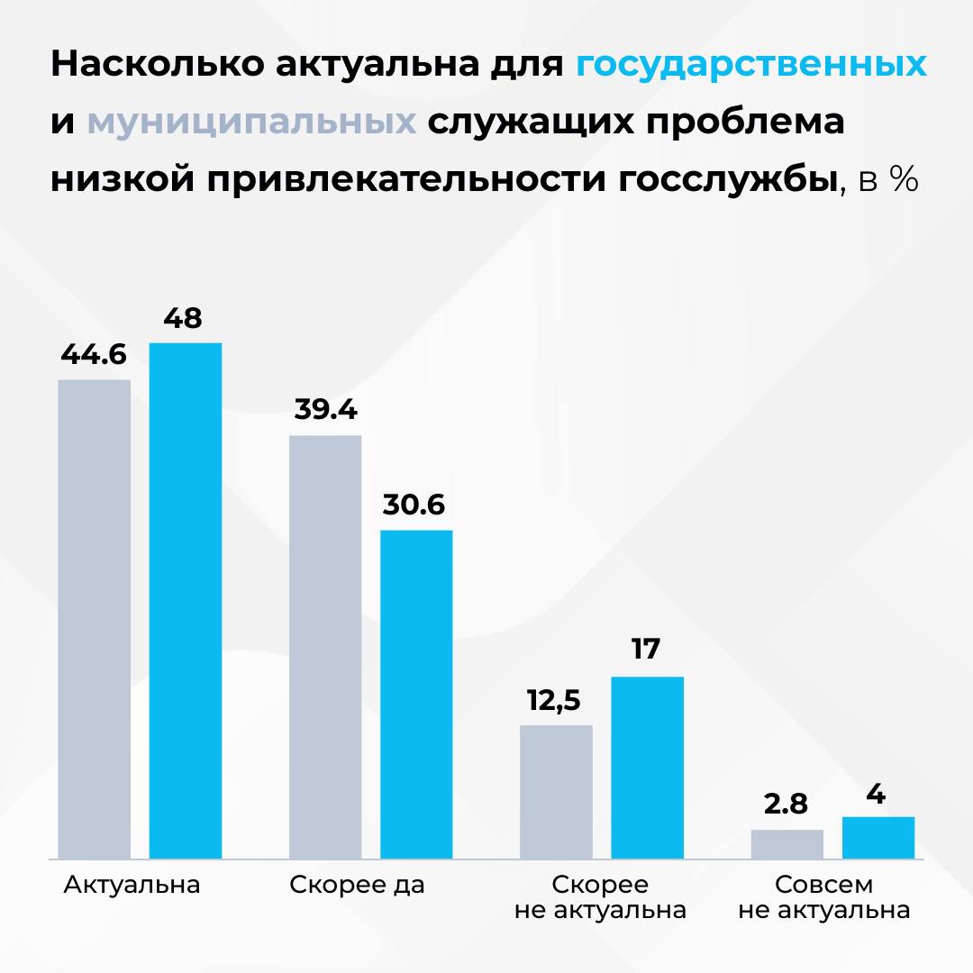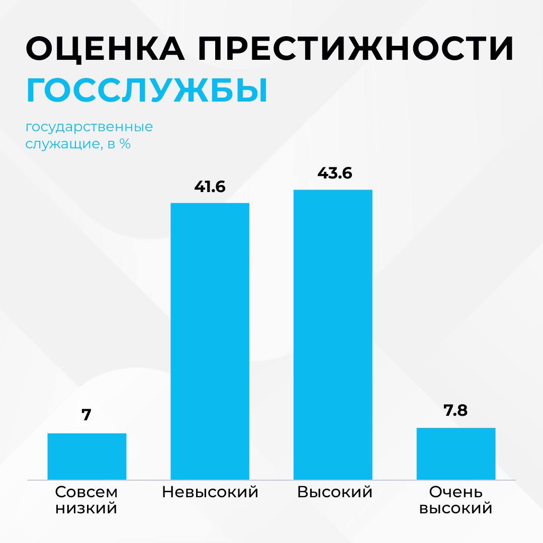 Оценка престижа госслужбы самими государственными служащими представлена на графике в этой статье. Наблюдается парадокс: большинство респондентов гордятся своей профессией, но запрос на повышение престижа, особенно среди муниципальных служащих, ощущается остро.